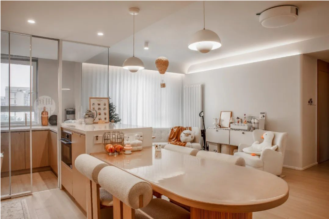 客餐廚三區無縫銜接,開放式布局讓空間感倍增,小戶型也能享受大宅的開闊視野。溫暖的奶油色調搭配柔和燈光,營造出溫馨舒適的居家氛圍。