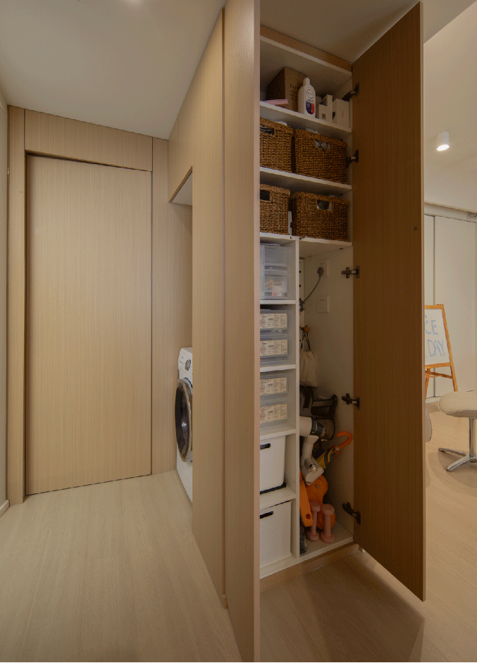 家政區位于全屋中心,清理房屋各處都十分方便。柜子內部根據物品靈活布置,空間小更要細致規劃。
