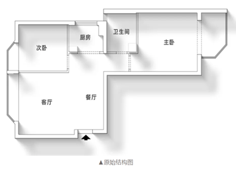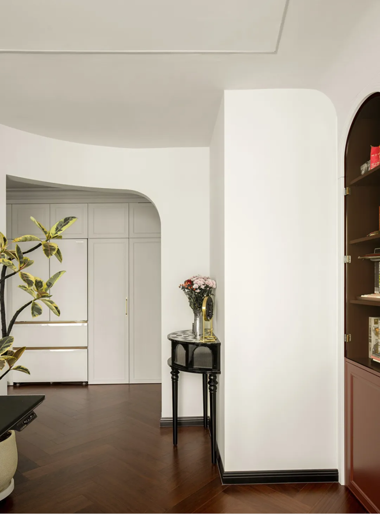 原始入戶的大開間在重新規(guī)劃后形成了一條新的弧形動線。