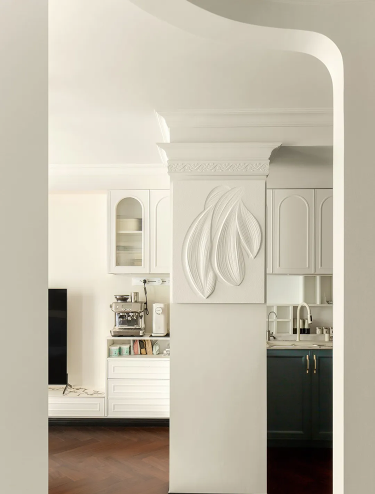沿著過道來到這個分岔口,從這里可以進入書房、客廳、廚房,動線流暢。無法拆除的煙道做成了裝飾柱。