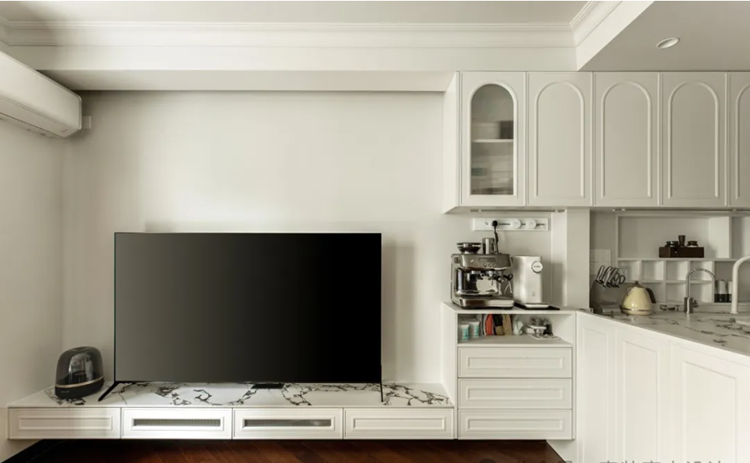 定制柜一直延續(xù)到客廳,空間利用得非常充分。白色柜門加入簡潔的線條,更加美觀有層次感。