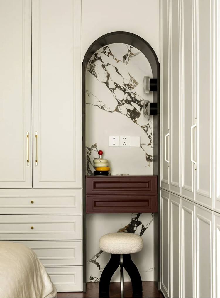 書房內(nèi)做了一排定制柜,融入了拱形門元素,很法式。左側(cè)是書柜,右側(cè)則是儲物柜+墨菲床的設(shè)計,實用又美觀。