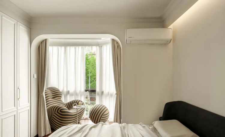 床尾是3.5米超長衣柜,安裝了女主人喜歡的折疊推拉移門,內(nèi)部采用金屬壁掛。衣服多以懸掛為主,搭配可抽拉的收納盒,整體收納量驚人。
